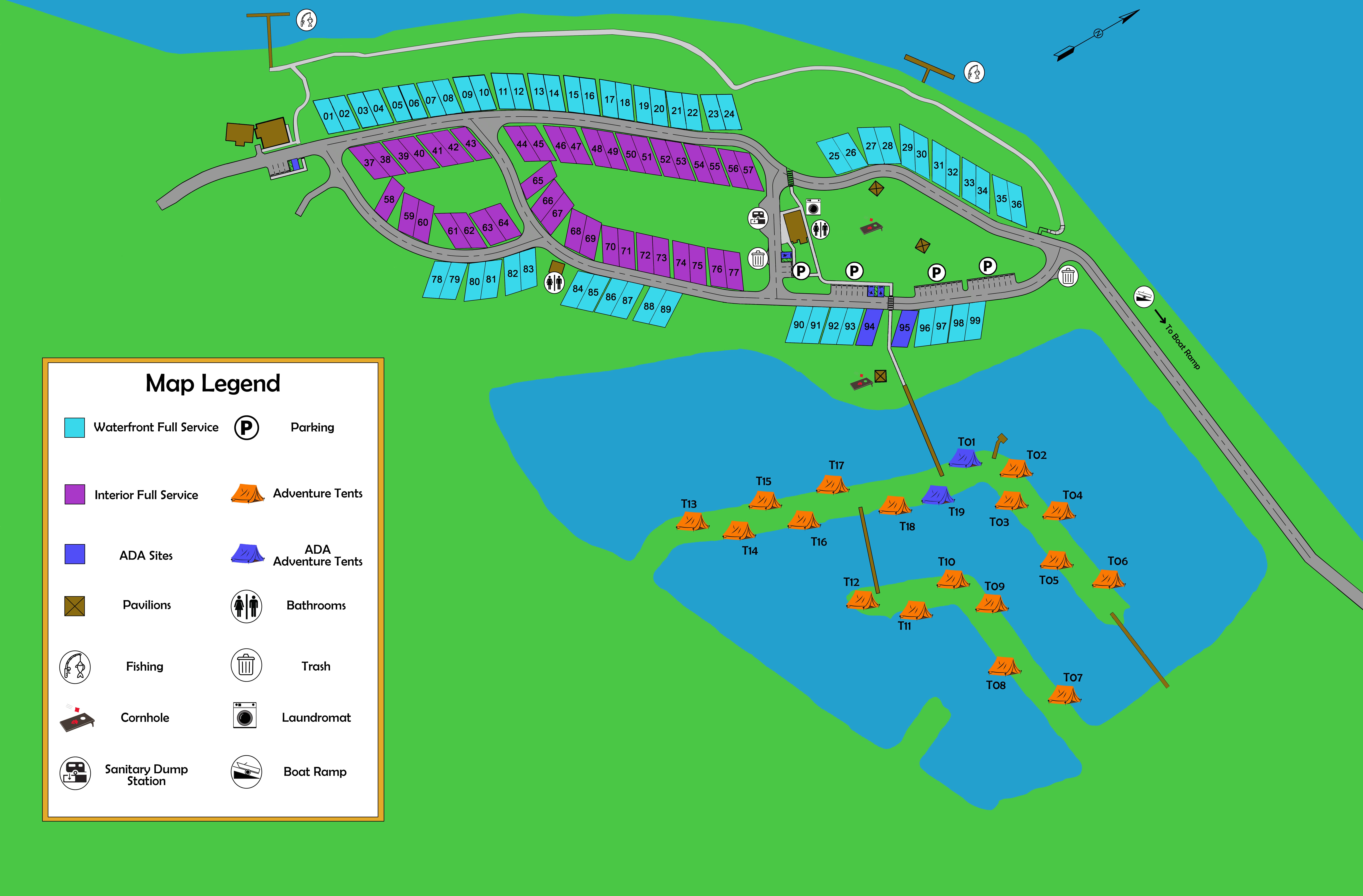 Our Adventure Tents cater perfectly to beginners or those seeking a hassle-free camping experience. Each site features a 10x10 canvas tent equipped with insect protection screens, a grill, a picnic table, a fire pit, and stunning water views. We also offer two ADA-accessible tents. View Campground Map
