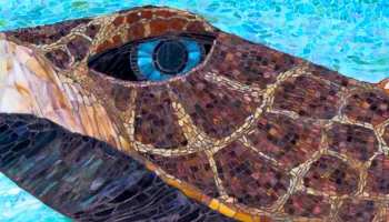 A turtle art piece made of colorful mosaic tiles